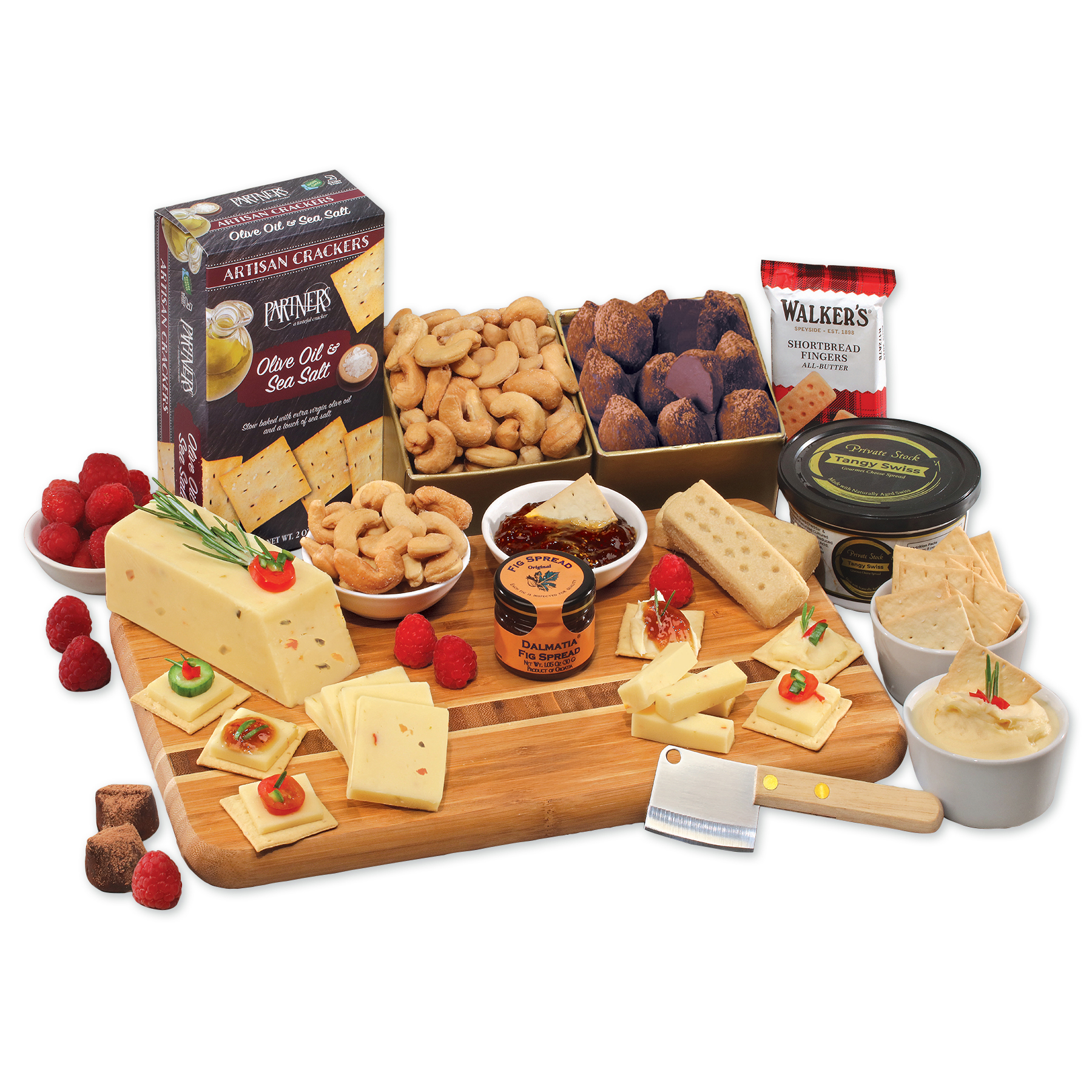 This oversized, sustainable bamboo board features a sleek contrasting stripe and comes loaded with an amazing array of gourmet delights, including amazing shelf stable Wisconsin cheese that does not require refrigeration upon receipt. We round out the flavor profile with superb selections, including spreads, sophisticated chocolates, and lightly-salted cashews, then finish it off with crackers and a cleaver for serving. The board is the perfect base for charcuterie assortments, ensuring they’ll remember your generosity long after everything has been enjoyed. Complies with CPSIA, FDA, Prop 65. 12.5″ L x 8″ W x 0.75″ H