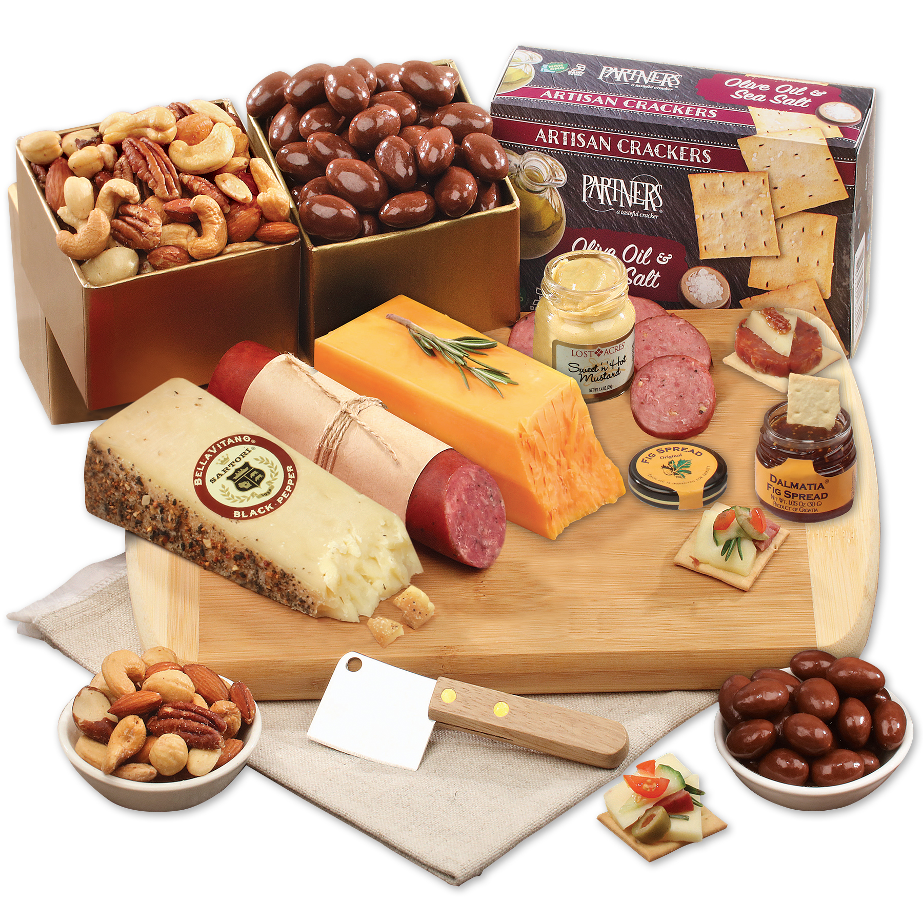 When they open this gift, the party will begin! Our elegant sustainable Bamboo cutting board with your imprint, of course, comes packed with all the necessary ingredients for a stellar charcuterie spread at home or at work, including a five-ounce blocks of award-winning Sartori® cheese. Serves 12-16. Complies with CPSIA, FDA, Prop 65. 12″ L x 8″ W x 0.5″ H