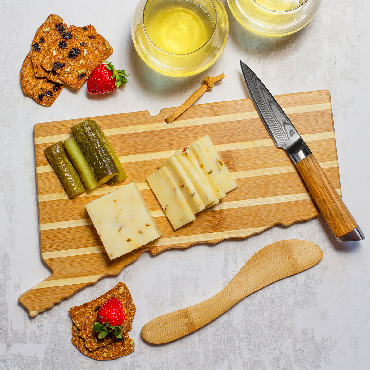 Show off your favorite state with the stylish Totally Bamboo Connecticut Serving Board with Spreader Knife Gift Set! This beautifully crafted cheese board set is shaped to the outline of Louisiana and features inlaid stripes of light color bamboo. This charcuterie board is a great way to serve guests crackers, cheeses, meats and other appetizers. The included bamboo spreading knife is ideal for spreading soft cheeses, dips and sauces onto crackers or bread. Surprise friends and family with the gift of “home”. Whether they still live in the state or have moved away, this is sure to be a gift they will cherish. When the serving is done, the board and spreader wipe clean easily with hand washing; do not soak or wash in the dishwasher. The board measures 11-3/8″ x 8-7/8″ and the spreader is 7-3/4″ long. Complies with Prop 65.