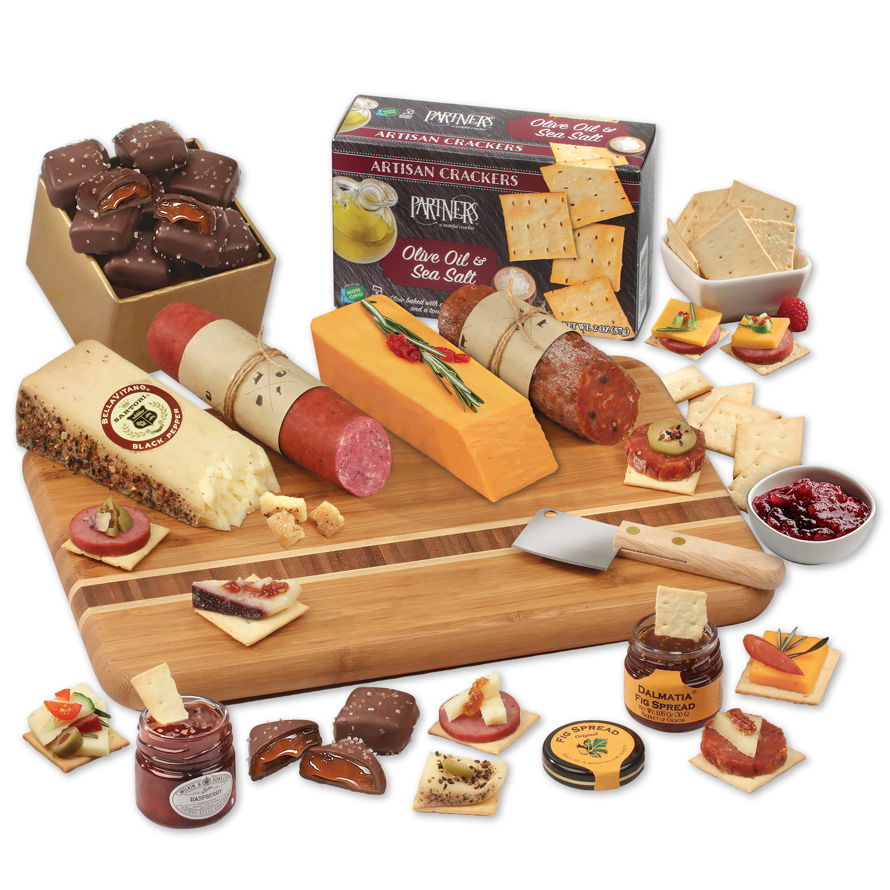 This oversized, sustainable bamboo board features a sleek contrasting stripe and comes loaded with an amazing array of gourmet delights, including award-winning Wisconsin cheese. We round out the flavor profile with superb selections, including sausage, spreads, and crowd-pleasing chocolate sea salt caramels, then finish it off with crackers and a cleaver for serving. The board is the perfect base for charcuterie assortments, ensuring they’ll remember your generosity long after everything has been enjoyed. Complies with CPSIA, FDA, Prop 65. 12.5″ L x 8″ W x 0.75″ H