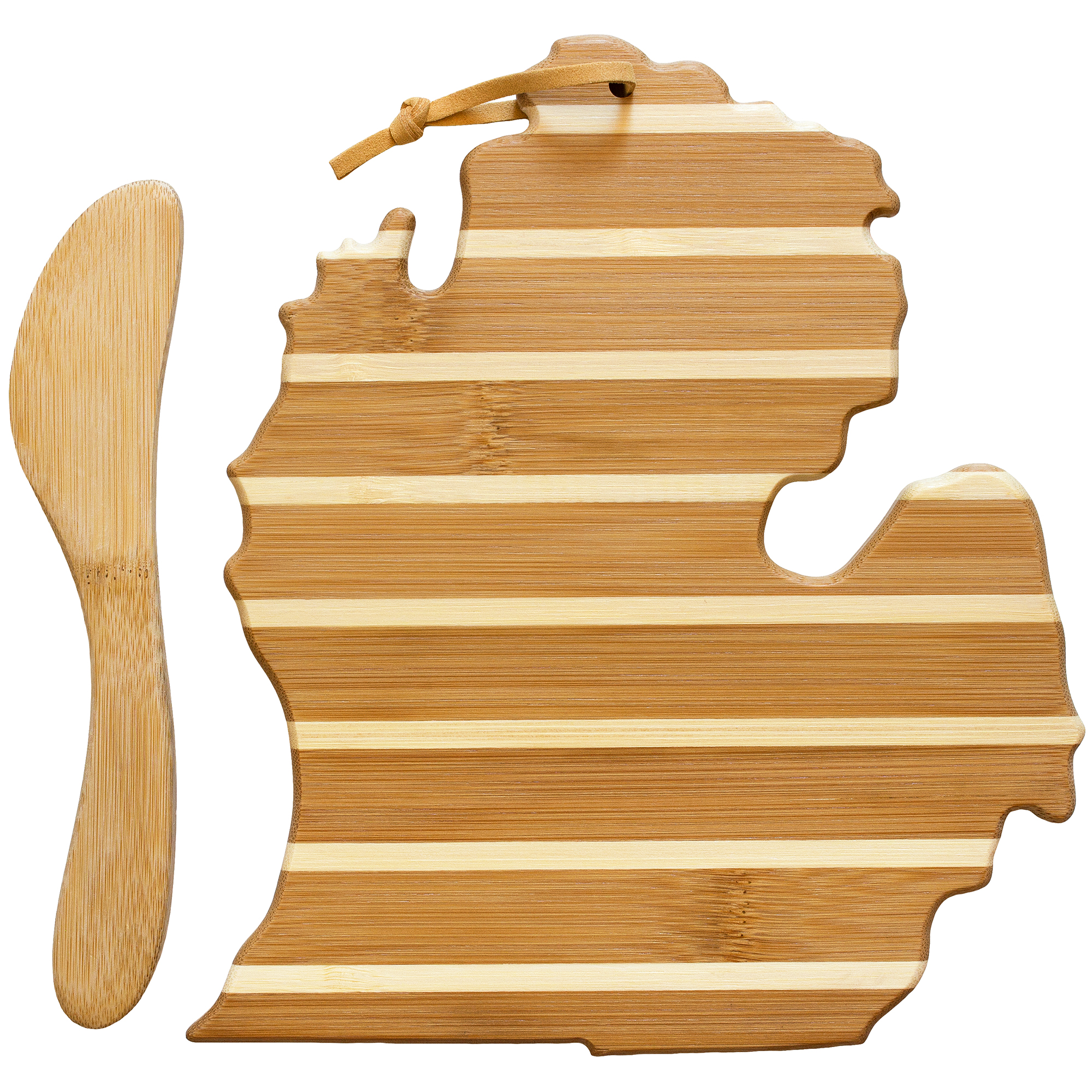 Show off your favorite state with the stylish Totally Bamboo Michigan Serving Board with Spreader Knife Gift Set! This beautifully crafted cheese board set is shaped to the outline of Louisiana and features inlaid stripes of light color bamboo. This charcuterie board is a great way to serve guests crackers, cheeses, meats and other appetizers. The included bamboo spreading knife is ideal for spreading soft cheeses, dips and sauces onto crackers or bread. Surprise friends and family with the gift of “home”. Whether they still live in the state or have moved away, this is sure to be a gift they will cherish. When the serving is done, the board and spreader wipe clean easily with hand washing; do not soak or wash in the dishwasher. The board measures 11-3/8″ x 8-7/8″ and the spreader is 7-3/4″ long. Complies with Prop 65.