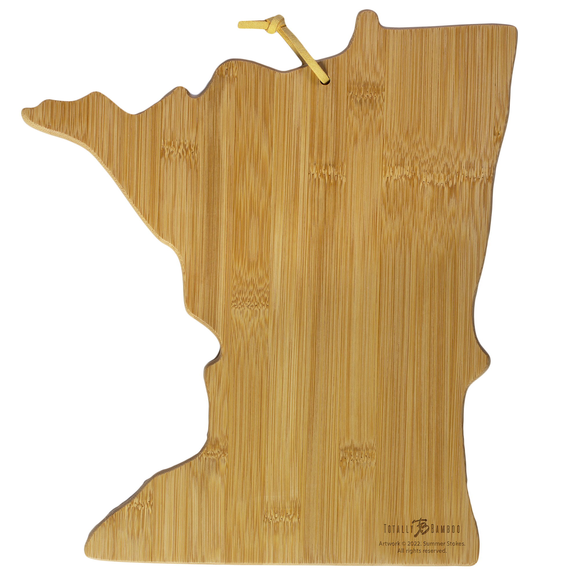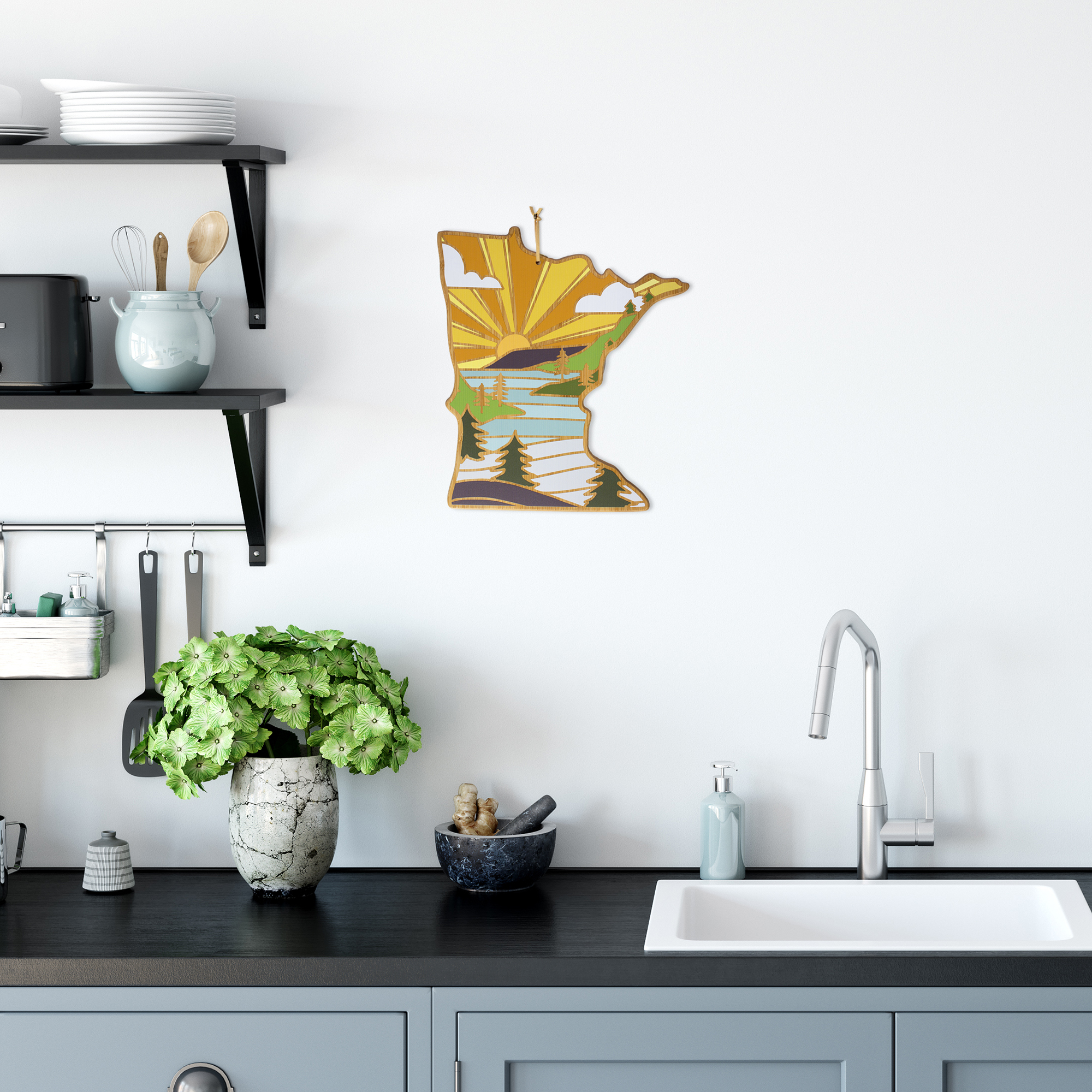 Celebrate life in The Land of 10,000 Lakes with the Minnesota State Shaped Cutting Board with Artwork by Summer Stokes. This Minnesota shaped board features beautiful landscape art by artist Summer Stokes. It’s a fun way to add a bit of “local flavor” to your next charcuterie or grazing board. Before serving, flip the board over for use as a knife-friendly bamboo chopping board on the blank back side. When not in use, the included hang tie allows the board to easily double as wall art. 11 3/4″ W x 13 1/4″ H x 5/8″ Thick