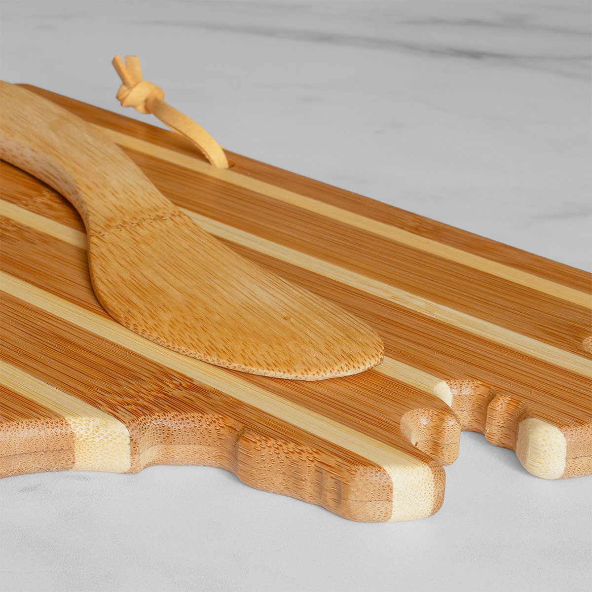 Show off your favorite state with the stylish Totally Bamboo North Carolina Serving Board with Spreader Knife Gift Set! This beautifully crafted cheese board set is shaped to the outline of Louisiana and features inlaid stripes of light color bamboo. This charcuterie board is a great way to serve guests crackers, cheeses, meats and other appetizers. The included bamboo spreading knife is ideal for spreading soft cheeses, dips and sauces onto crackers or bread. Surprise friends and family with the gift of “home”. Whether they still live in the state or have moved away, this is sure to be a gift they will cherish. When the serving is done, the board and spreader wipe clean easily with hand washing; do not soak or wash in the dishwasher. The board measures 11-3/8″ x 8-7/8″ and the spreader is 7-3/4″ long. Complies with Prop 65.