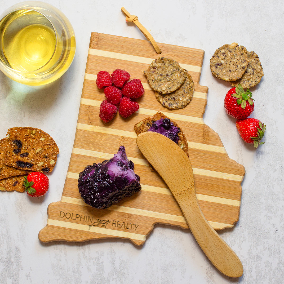 Show off your favorite state with the stylish Totally Bamboo Rhode Island Serving Board with Spreader Knife Gift Set! This beautifully crafted cheese board set is shaped to the outline of Louisiana and features inlaid stripes of light color bamboo. This charcuterie board is a great way to serve guests crackers, cheeses, meats and other appetizers. The included bamboo spreading knife is ideal for spreading soft cheeses, dips and sauces onto crackers or bread. Surprise friends and family with the gift of “home”. Whether they still live in the state or have moved away, this is sure to be a gift they will cherish. When the serving is done, the board and spreader wipe clean easily with hand washing; do not soak or wash in the dishwasher. The board measures 11-3/8″ x 8-7/8″ and the spreader is 7-3/4″ long. Complies with Prop 65.