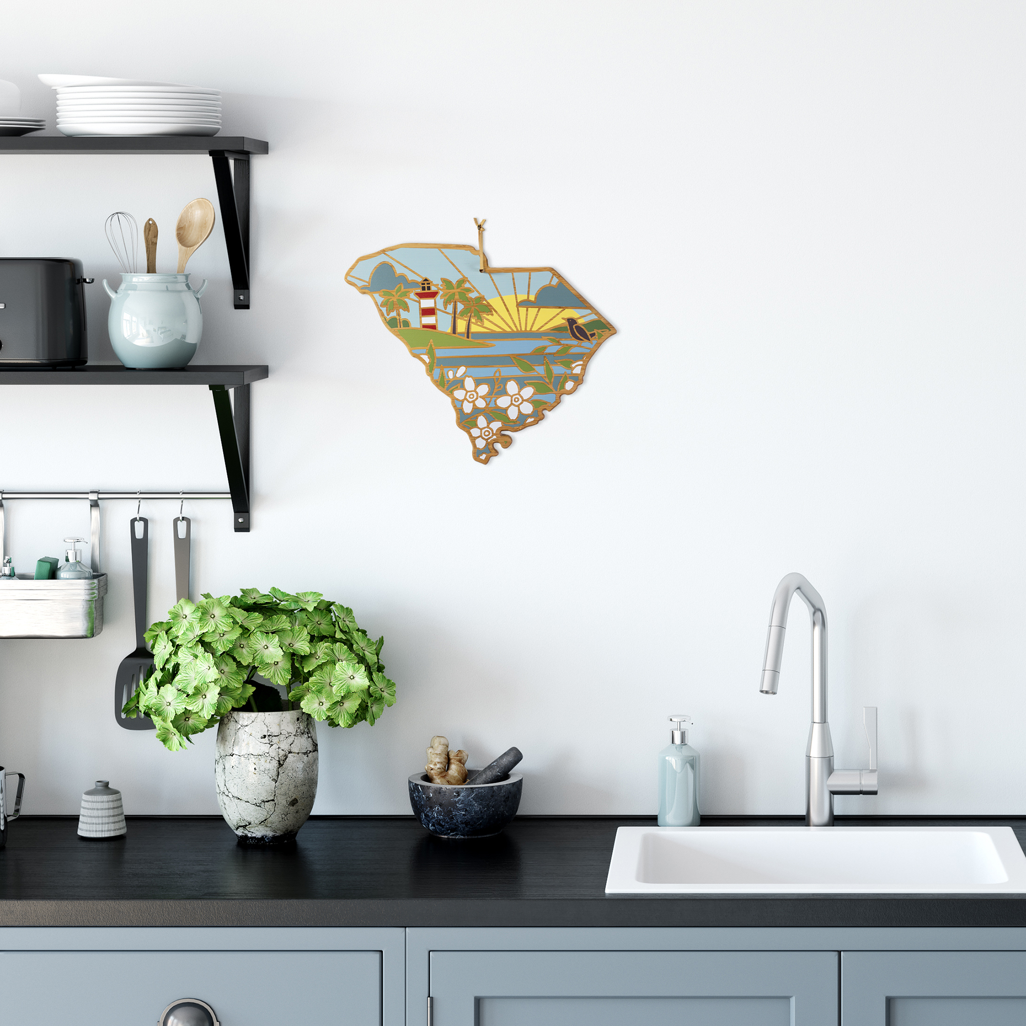 Celebrate life in The Palmetto State with the South Carolina State Shaped Cutting Board with Artwork by Summer Stokes. This South Carolina shaped board features beautiful landscape art by artist Summer Stokes. It’s a fun way to add a bit of “local flavor” to your next charcuterie or grazing board. Before serving, flip the board over for use as a knife-friendly bamboo chopping board on the blank back side. When not in use, the included hang tie allows the board to easily double as wall art. 14″ L x 11 1/2″ W x 5/8″ Thick